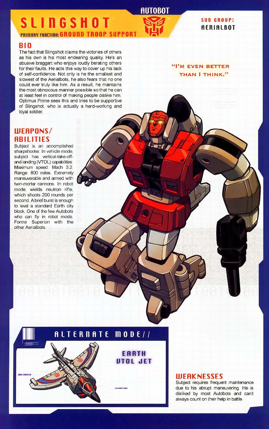 弹弓总是在不停的唠叨,其实是在不停的自夸,盗用别人的功绩,倒不是他品质不佳,主要是他不自信。作为飞行太保中最慢的成员,他的速度只能达到1.6马赫,飞行半径也最短,仅有1300KM。他必须在其他的方面找回场子。但这种个性让很多汽车人对弹弓敬而远之。其实弹弓大可不必如此,擎天柱就很欣赏他,他这种拼命想要证明自己的欲望正是汽车人所需要的。弹弓变形为霍克-西德利鹞式GR3战斗机,可以垂直起降,具备最强的机动性,可以在别的队友不可能起降的地方完成动作,因为他不需要机场和跑道。同时,弹弓还是精准的射手,飞机形态下装有双管迫击炮,机器人形态下使用中子枪。