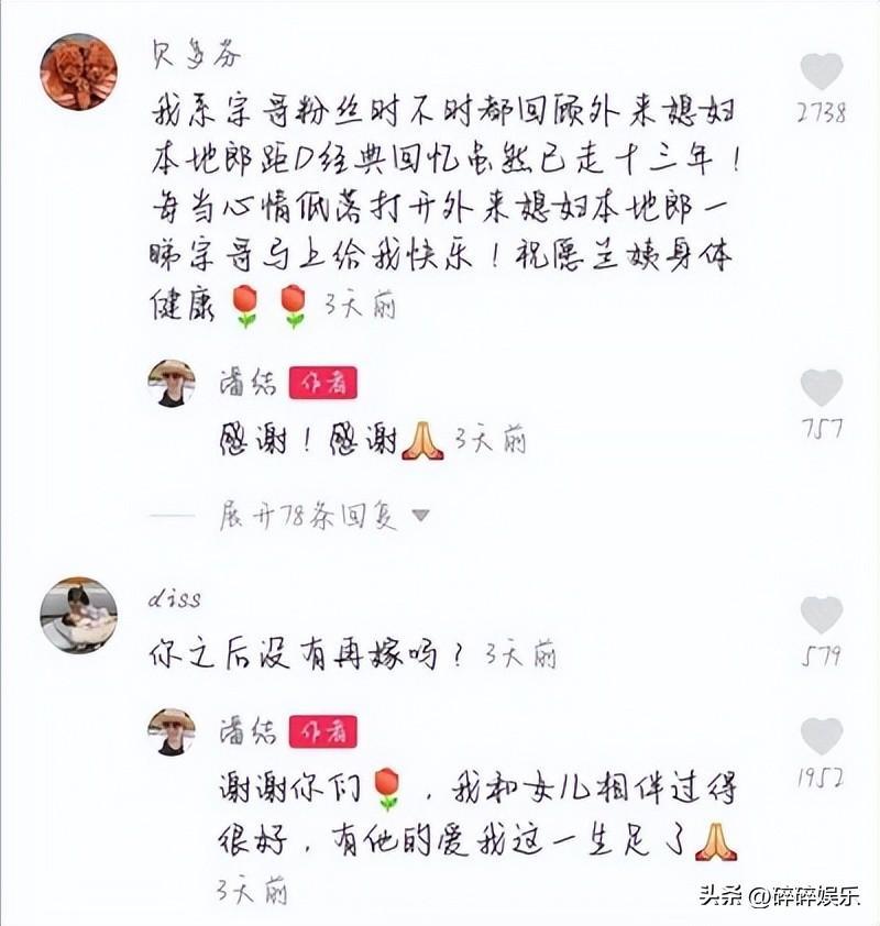 郭昶的生活态度也一直让潘结多了很多面对未来的勇气,最近几年有网友关心潘结的近况,问她是否会再嫁,潘结的回复是“我和女儿相伴过得很好,有他的爱我这一生足矣!”