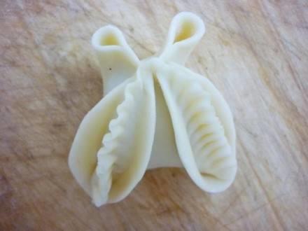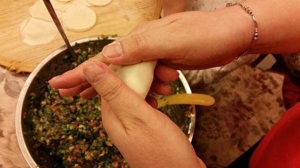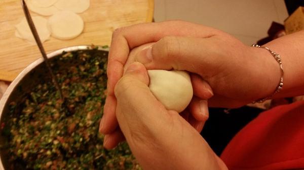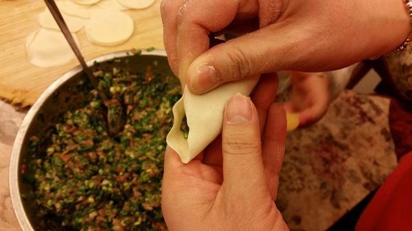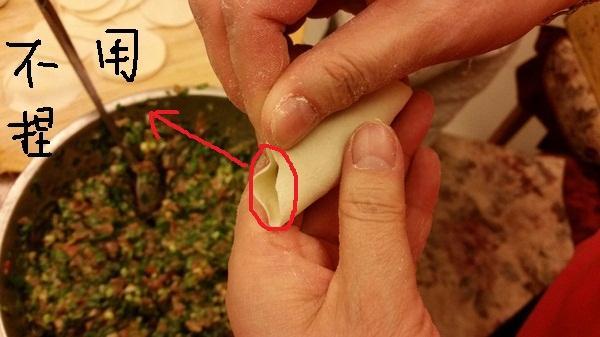 言归正传……包饺子最主要是(下面两字,请大家跟我一起念)——shou手fa法。对,很好,再来一遍,手 法 。很好,大家学得很快,你们已经掌握了包饺子的精髓。