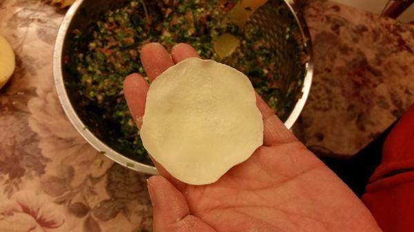 2、用右手(当然不是直接用手,而是用右手手中的勺子)将约一汤勺的饺子陷放置于面皮中央,并用勺子底部按压(其实动作很灵活,可以运用到轻拢慢捻抹复挑等动作)饺子馅,使其集中在饺子皮中央。此时饺子馅不是成半球状,而是“铺”在饺子皮上,以方便后续的工作。左手顺势成“碗”状,托住饺子皮。