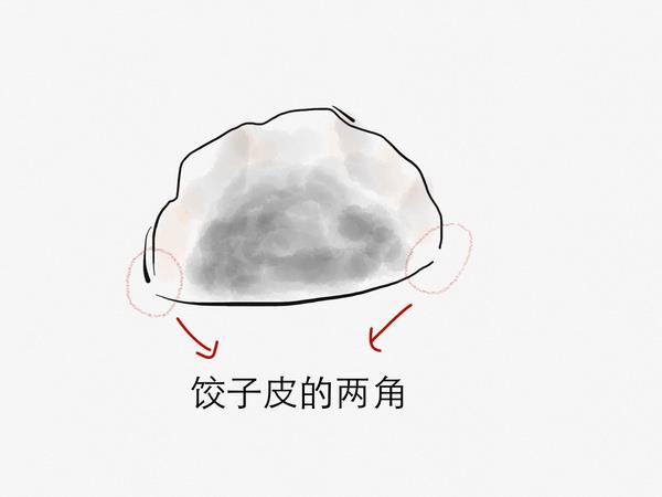 然后右手包住左手,使饺子皮的两角紧挨着双手的虎口,大拇指放下,按住饺子皮的四周边缘,切忌按住饺子馅。