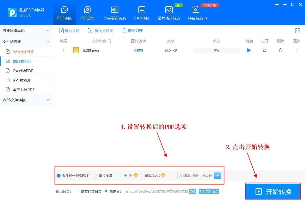 最后,对于添加的文件,设置转换后的PDF选项,点击【开始转换】,等待片刻,图片便可转换为CAD。