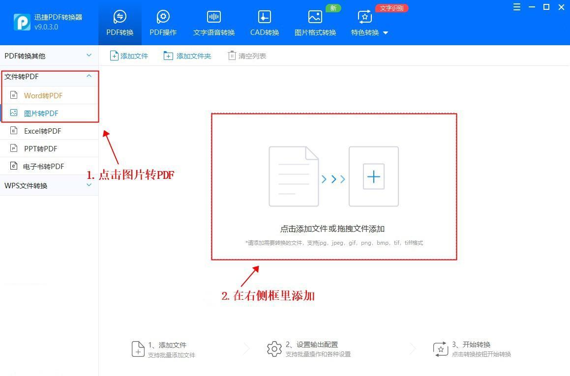 首先我们下载安装PDF转换器,打开后点击左上方工具栏的【文件转PDF】-【图片转PDF】。或者点击右侧工作区也可以添加文件。