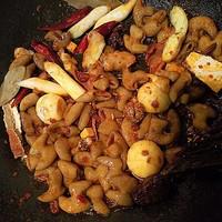 九、加入豆瓣炒香后,再加入葱姜蒜和所有香料继续炒香,加入白酒和酱油翻炒均匀。