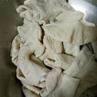 四、把面粉冲干净,肠口用水过一过,白净的肠子就准备好了。我买的是半熟的肠子,如果是完全新鲜的肠子,需要重复以上做法多次,并在过水是往盆里加白醋和盐一起搓洗。