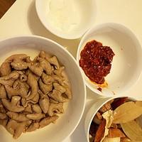 六、捞出煮好的肥肠沥干,剁碎豆瓣酱,准备各种材料备用。