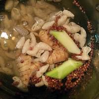 五、把洗净的大肠切成小断,不要太小,肠会缩水的。放入锅中加入足量的水,一些白酒,一把花椒,葱段和姜片开大火煮30分钟以上,全程不要盖锅盖,让膻味挥发。