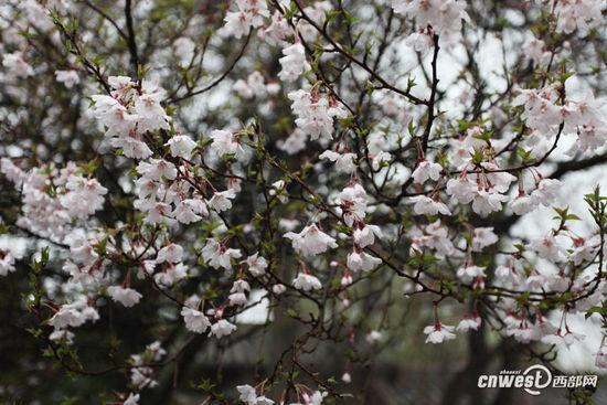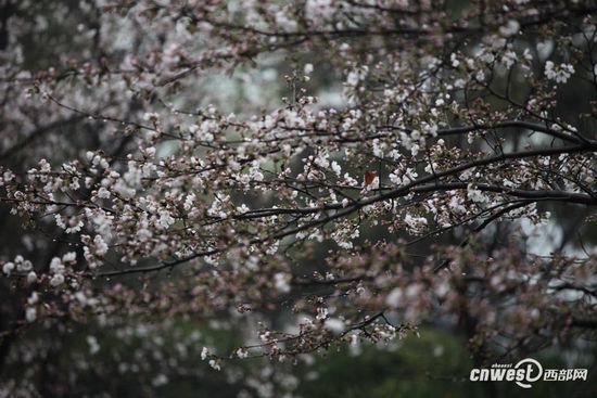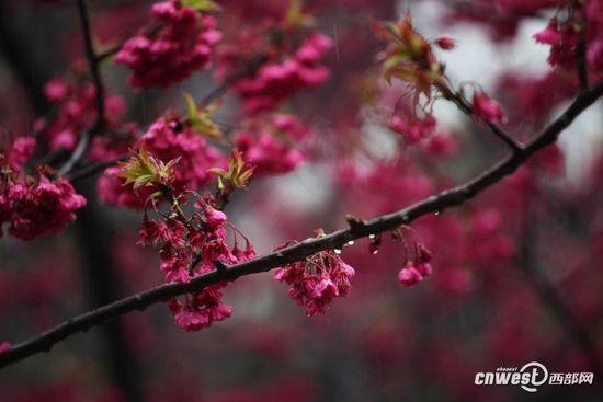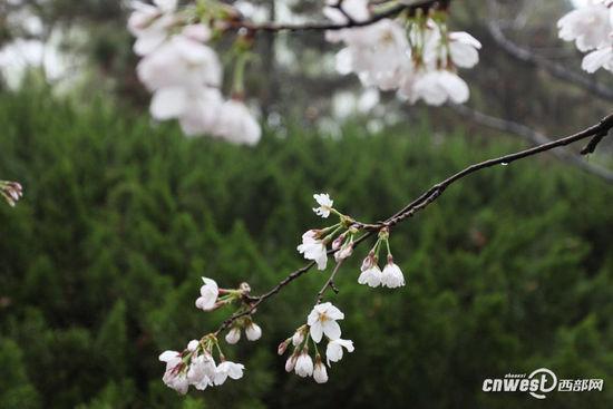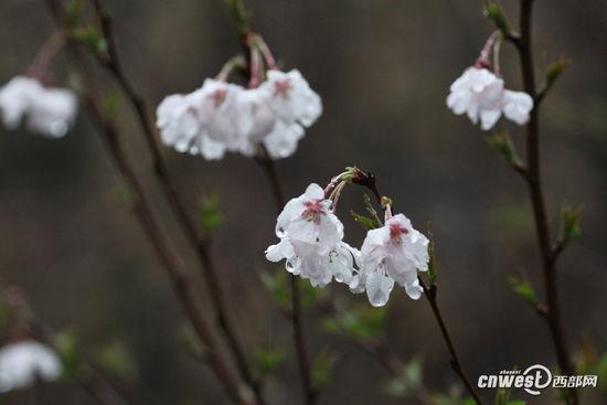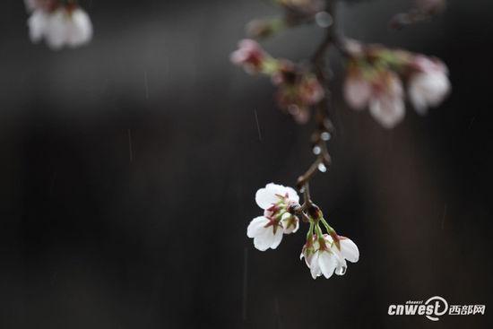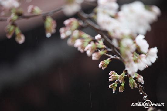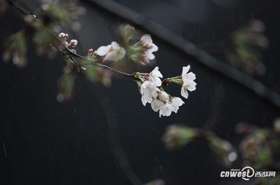 淅淅沥沥的春雨里,早期开放的樱花显得格外清新美丽