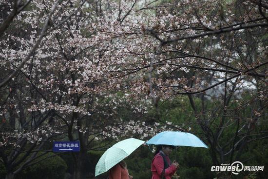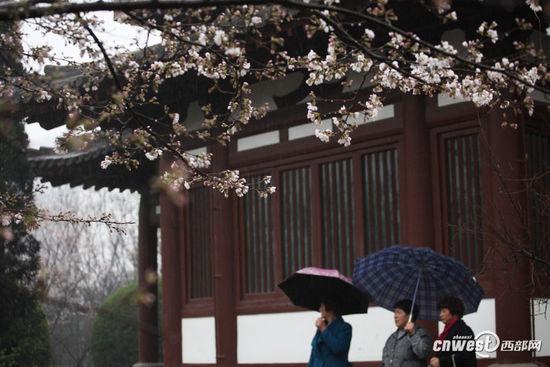 早期开放的樱花像春的使者迎接着雨中赏花人