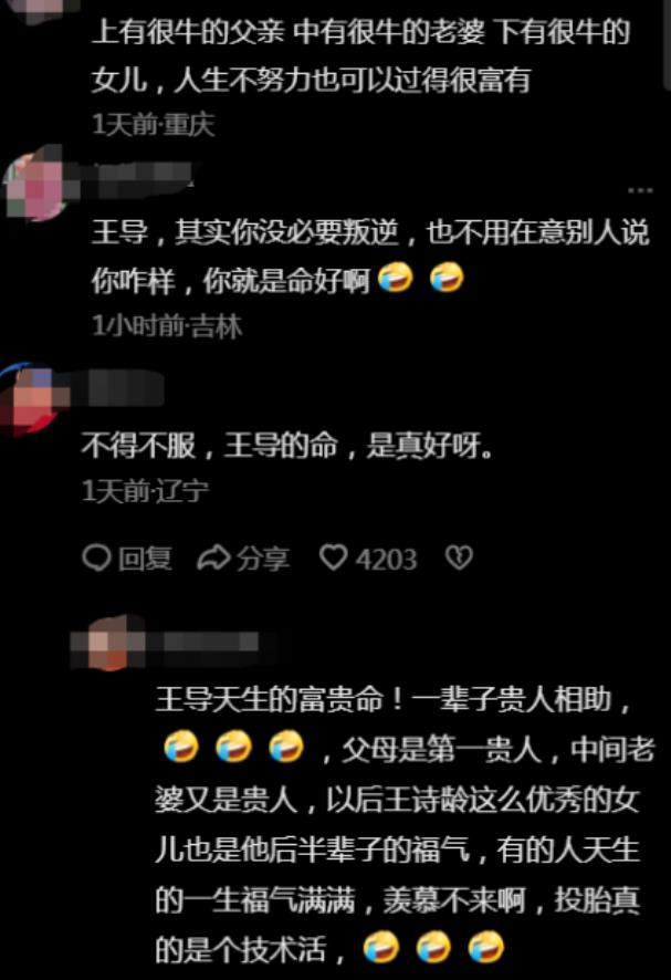 有网友在评论区开玩笑称,王岳伦这是天生的富贵命啊。上有很牛的父亲,中间有很牛的老婆,下还有很牛的女儿,人生即使不努力,也会过得很舒服。有的人就是天生的富贵命,羡慕不来的。