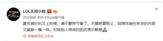 不过小智很快对热搜一事作出正面回应,表示之所以造成这么大的影响和关注,肯定是有人在背后搞事,故意带节奏想把矛盾升级。小智表示:“这都能上热搜?大家不要被带节奏,更不要断章取义,自媒体发的文案都一模一样,对给大家带来的困扰表示歉意。”