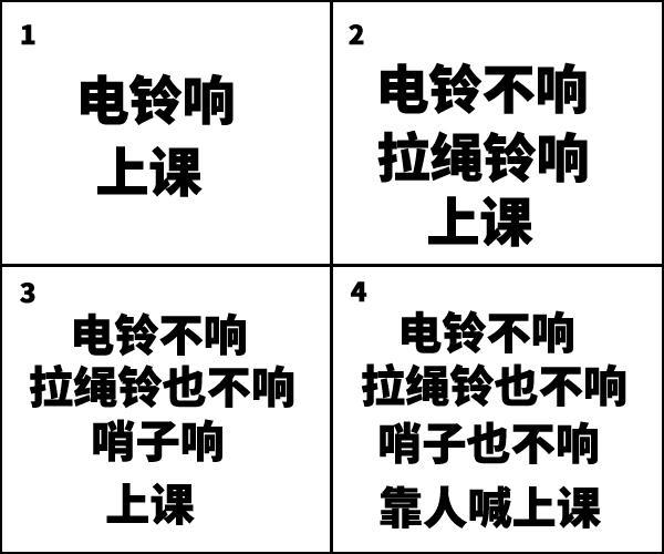 这下大家起哄的更厉害了。最后大叔没办法,只好自己到各个有学生的地方喊大家上课。我们才乖乖进教室。像这种近乎“奇迹”的事件,我想大家也有过类似的经历,我们通常都会信一些迷信的说法,类似于未知的力量等,一个思维清晰的人会怎么看这种事件呢?就以这个上课铃声事件做例子,画出4个格子,填入四种可能,如下图:
