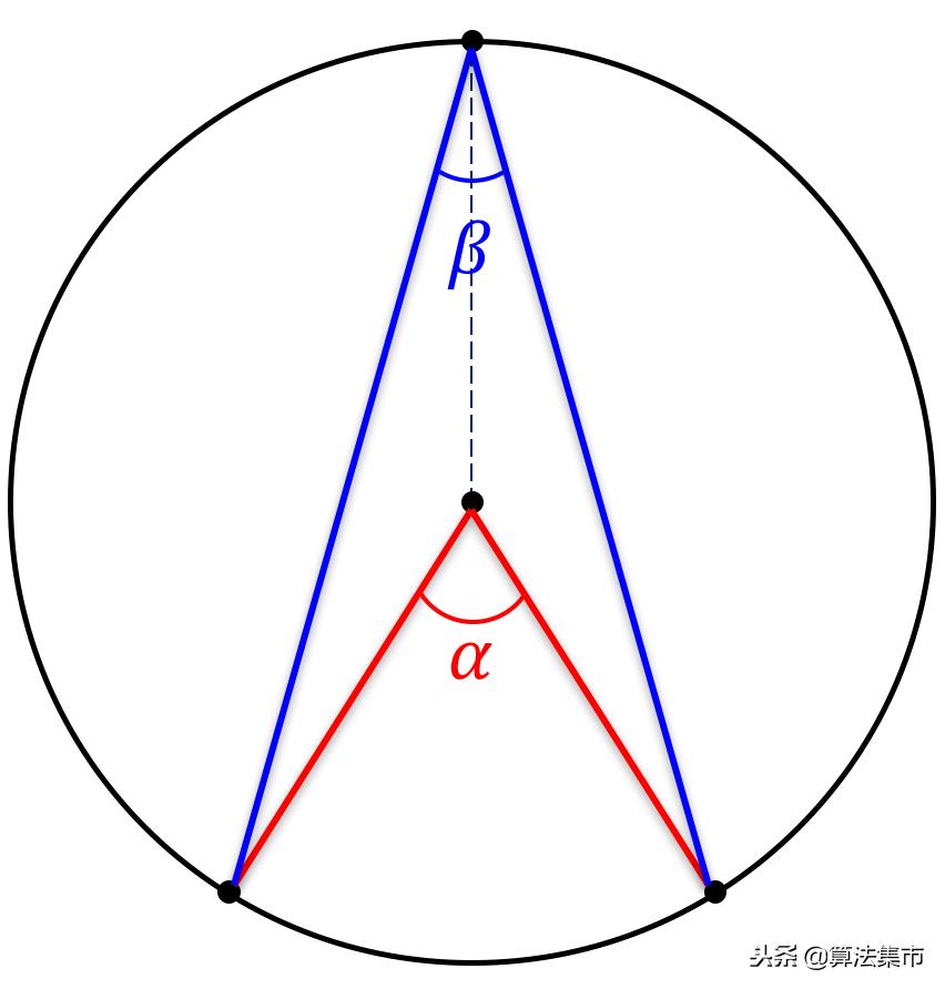 圆周角定理:一条弧所对的圆周角等于它所对的圆心角的一半。即: