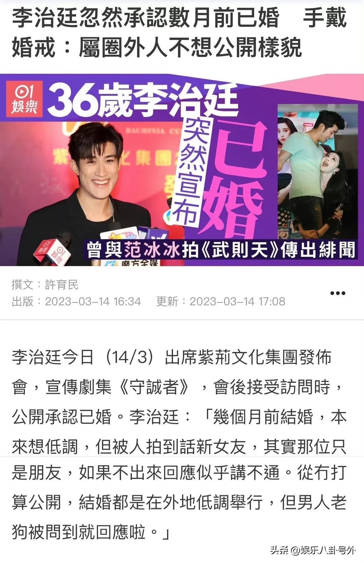 36岁的李治廷除出席活动,被发现手指已带婚戒,因此发现已经结婚,老婆圈外中籍混血儿。