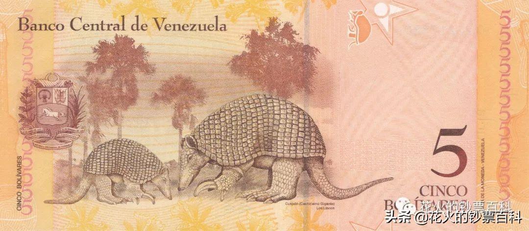 背面是委内瑞拉濒危物种犰狳(Priodontes maximus)。犰狳(读音:qiú yú),是生活在中美和南美热带森林、草原、半荒漠及温暖的平地和森林的一种濒危物种,犰狳是除人类以外唯一会携有麻风杆菌的动物。