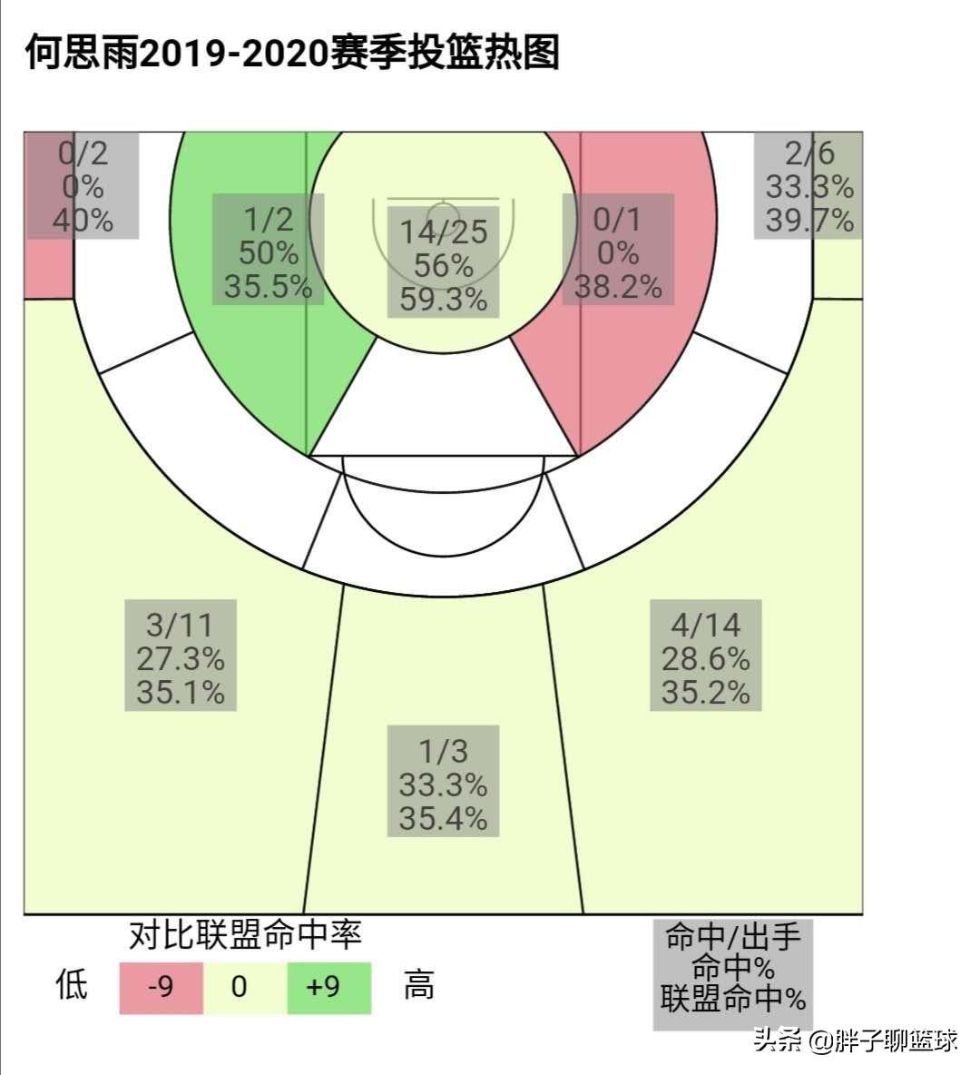 赛季至今通过何思雨的投篮热图来看,他具备自主进攻持球冲击篮下的能力,同时还能在外线出手具备一定的威胁。在距离篮筐0-1.5米的距离出手频率为29.7%,命中率为63.2%。在队内何思雨更多的进攻时在三分线外,赛季至今三分出手总数36次命中10记,特别是右侧底角4投2中,命中率为50%,而且除了左侧底角没有命中之外,其余位置三分投射均有成效,就是在命中率上面略显尴尬,三分总体命中率仅为27.8%。进攻效率不高仅为84.9.