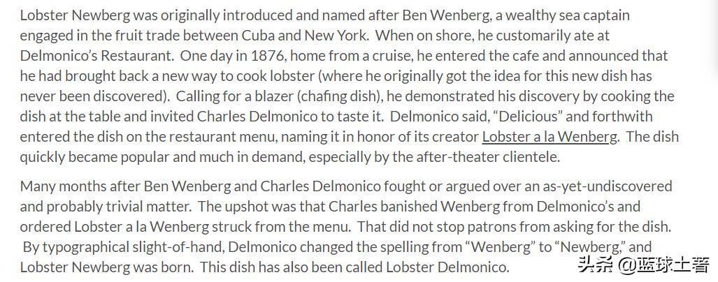 那为什么叫纽堡龙虾呢?虽然美国有个叫Newberg(纽伯格)的城市,但跟这个没关系。我查了很多外网资料,历史的正文如下描述: