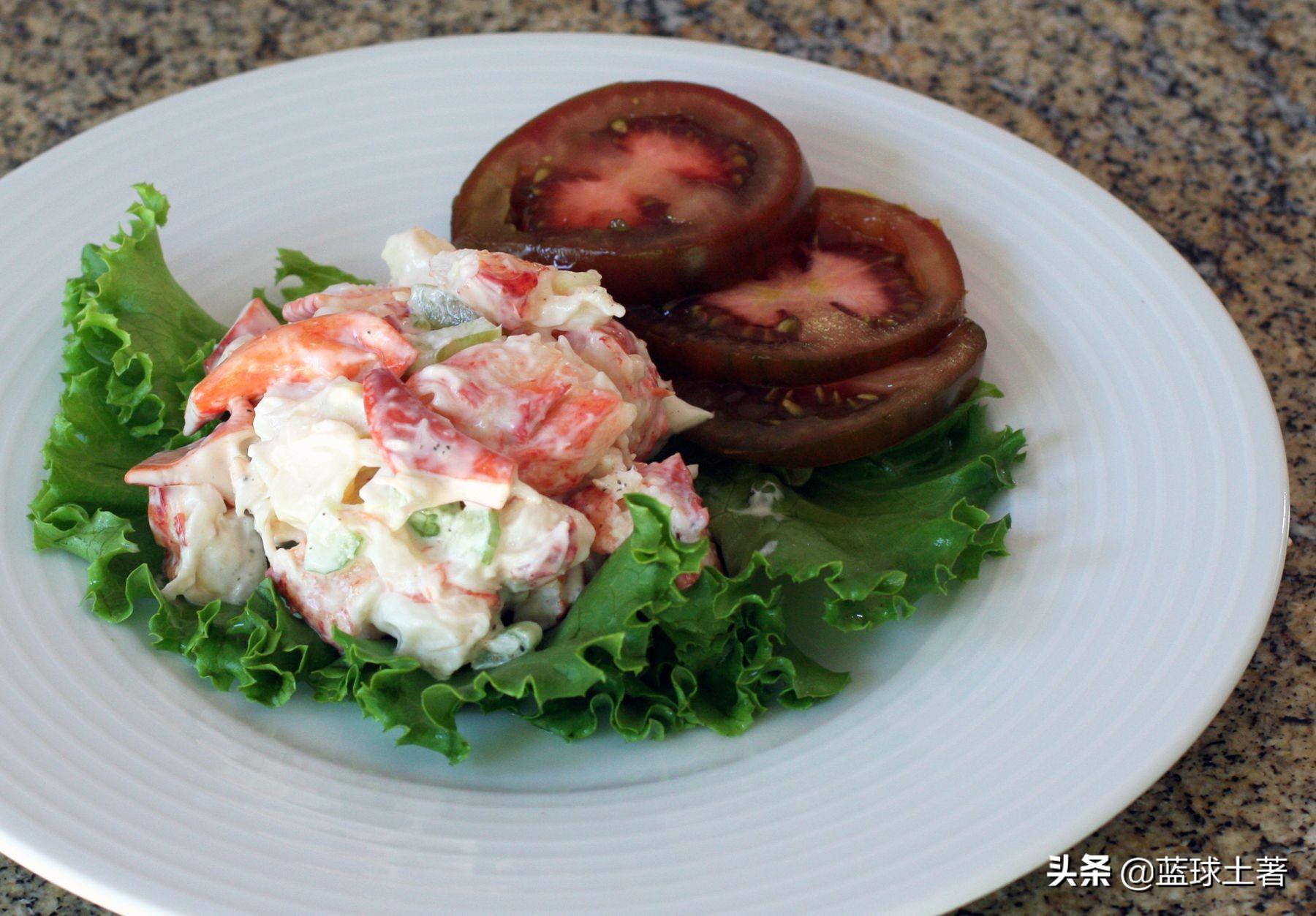 煮熟切块的龙虾肉与柠檬汁、鳄梨?、欧芹混合在一起,加入蛋黄酱轻轻搅拌,然后加入盐和胡椒粉调味。搭配切成薄片的西红柿和黄瓜作为午餐最好不过了,这种龙虾沙拉还可以制作三明治,用甜面包或传统烤热狗面包,配生菜夹着吃。