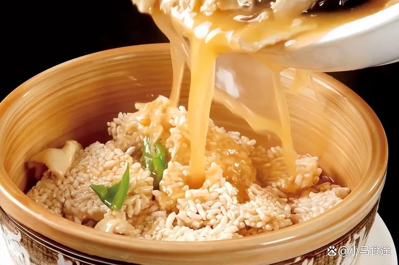 4.净锅放入菜籽油,油温7成热,投入锅巴炸成金黄酥脆,捞出装盘,随同装有肉片滋汁的碗上桌,趁热将碗内肉片滋汁淋于锅巴上面,发出炸裂声,即可享用。