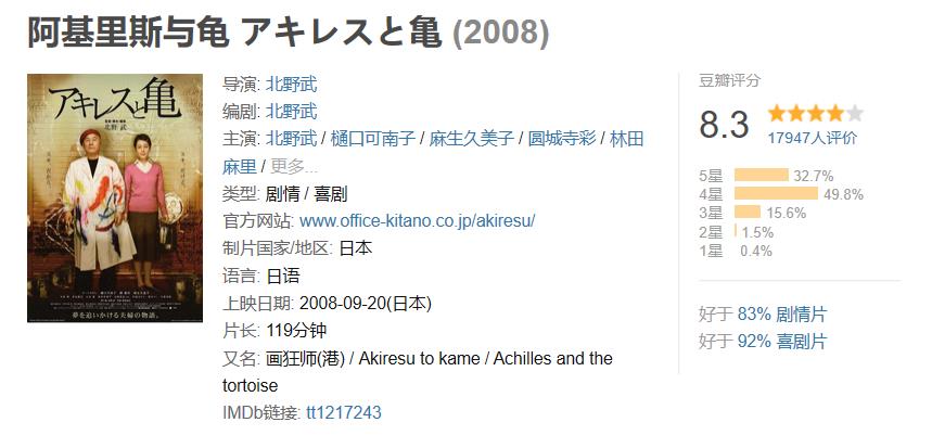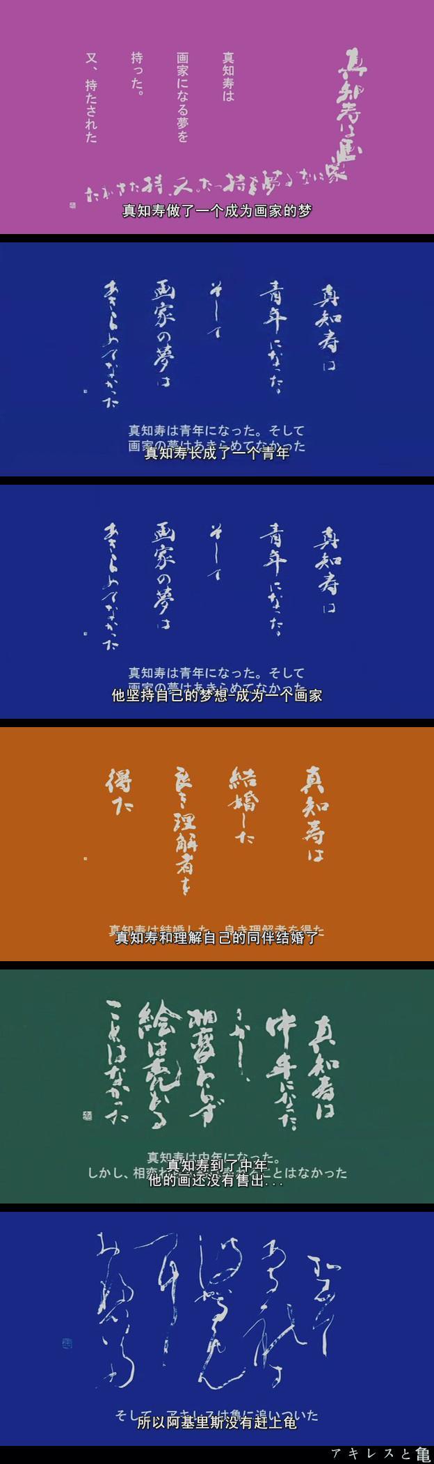 正如芝诺的悖论,阿基里斯永远也追不上乌龟 ,《阿基里斯与龟》这个片名从表层到隐喻,承载了导演对于主题的三层解析。