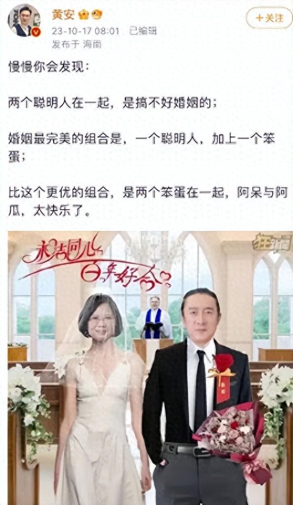 歌手黄安晒出与蔡英文结婚照,网友纷纷表示:为中国的统一而结婚