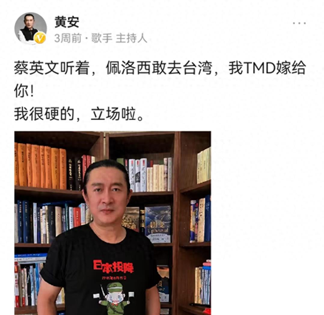 除此之外,在听说佩洛西要去访问台湾时,黄安在微博上公开叫嚣蔡英文“蔡英文听着,佩洛西敢去台湾,我TMD就嫁给你,我立场很硬的。”