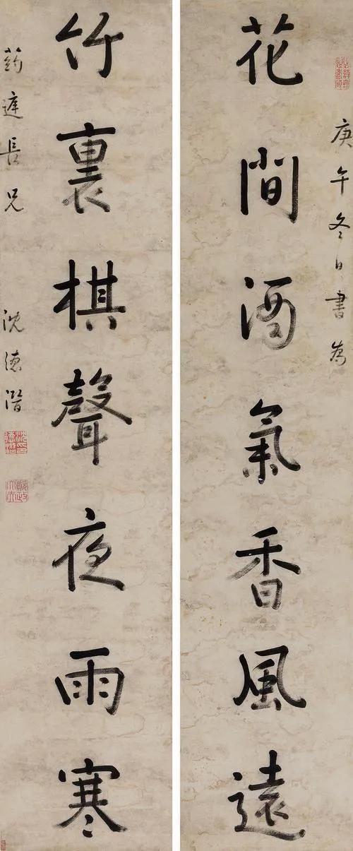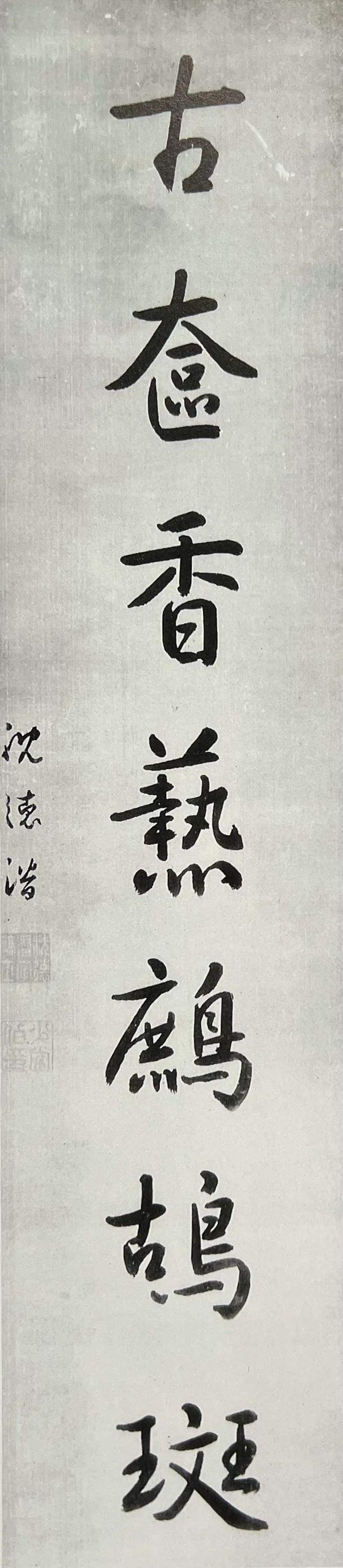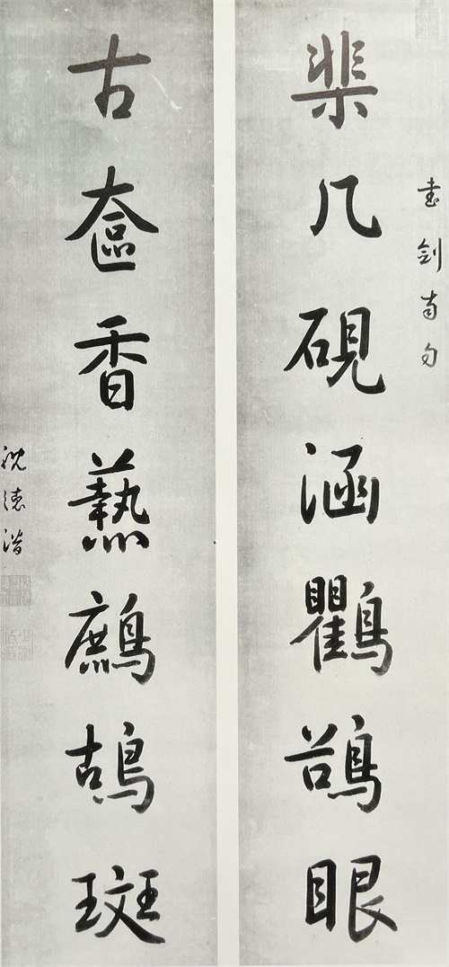 此联集南宋诗人陆游诗句而成,诗题《斋中杂记》之三,见《剑南诗稿》卷三十二。其书以楷法为主,温文尔雅,志气平和,颇有二王神韵。德潜凭藉对中国传统艺术的理解,一扫浮媚轻佻之气,典雅温润,秀而不俗。书用库绢,更增添了几分苍厚朴茂之气。