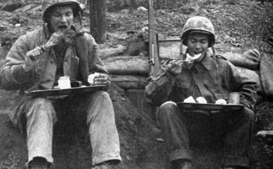 但是美军仰仗海空军优势,大量的军队所需的给养源源不断的通过空运,陆运送到前方。美军伙食丰富,有烤火鸡、炸薯条、牛肉馅饼、沙拉、水果蛋糕、甚至还有鸡尾酒。
