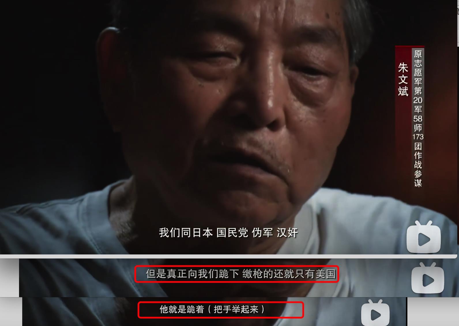 老英雄过去跟日本兵和国民党兵都较量过,但在战斗中跪下缴枪的只有美国大兵。朱文斌说,他们是跪下把手举起来投降。中国俗话说“男儿膝下有黄金”,而美国人不一样,思想很开放,说跪就跪,一点军人的尊严也不要,一点都不脸红。朱文斌认为,美国兵是被英勇的志愿军吓坏了,志愿军在伤亡巨大的情况下,还舍生忘死地冲击,继续爬着往前冲,这种精神,谁见了都会胆战心惊。