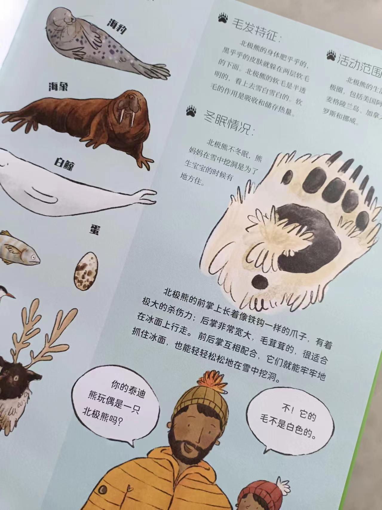 不看不知道,原来熊家族有这么多不同成员。而且书中还分别详细介绍了他们的长相,毛发特征,还有生活地区,以及他们的冬眠情况。