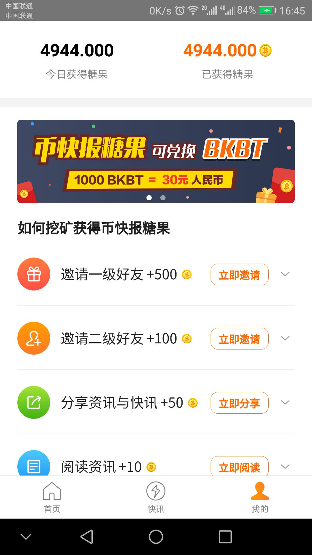 币快报与传统的新闻资讯浏览软件不同,用户在观看浏览资讯的同时即是在进行挖矿,获取糖果,从而增加瓜分比特币的份额!获取糖果可以通过邀请好友、分享资讯和阅读资讯获得!每天都能获取!