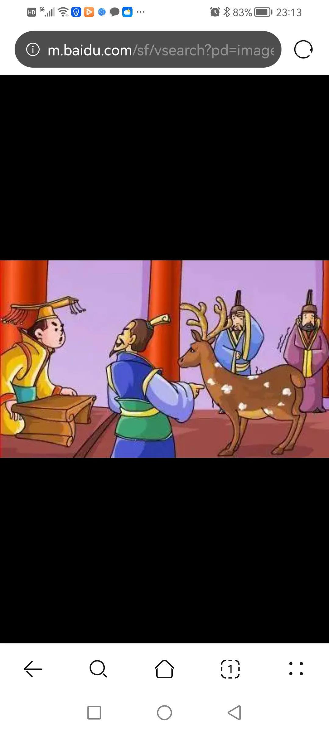 一天上朝时,宰相赵高让人牵来一只鹿,满脸堆笑地对秦二世说:“陛下,我献给你一匹好马。” 秦二世一看,心想:这哪里是马,分明是一只鹿嘛!便笑着对赵高说:“这是一只鹿,你怎么说是马呢?”赵高面不改色地说:“请陸下看清楚,这的确是一匹千里马。秦二世又看了看那只鹿,将信将疑地说:“马的头上怎么会长角呢?”赵高一转身,用手指着众大臣大声说:陸下如果不信我的话,可以问问众位大臣。”这时候大臣们都被赵高的一派胡言搞的不知所措,私下里嘀咕:这个赵高搞什么名堂?是鹿是马这不是明摆着吗!当看到赵高脸上露出阴险的笑容,两只眼睛骨碌碌轮流地盯着每个人的时候,大臣们忽然明白了他的用意。一些平时就紧跟赵高的奸佞之人立刻按照赵高的说法,对皇上说:“这的确是一匹千里马。”一些胆小怕事的人都低下头去,不敢说话。但还是有正直的人,坚持认为是鹿而不是马。秦二世见众口不一,以为自己冲撞了神灵,糊涂了,才会认马为鹿。于是召来太卜算一卦,太卜在赵高的授意下,对二世说:“陸下祭祀时没有斋戒沐浴,故至于此。”秦二世信以为真,在赵高的安排下,打着斋戒的幌子,躲进上林苑游猎去了。秦二世一走,赵高便阴谋杀害了那些回答是鹿的大臣。