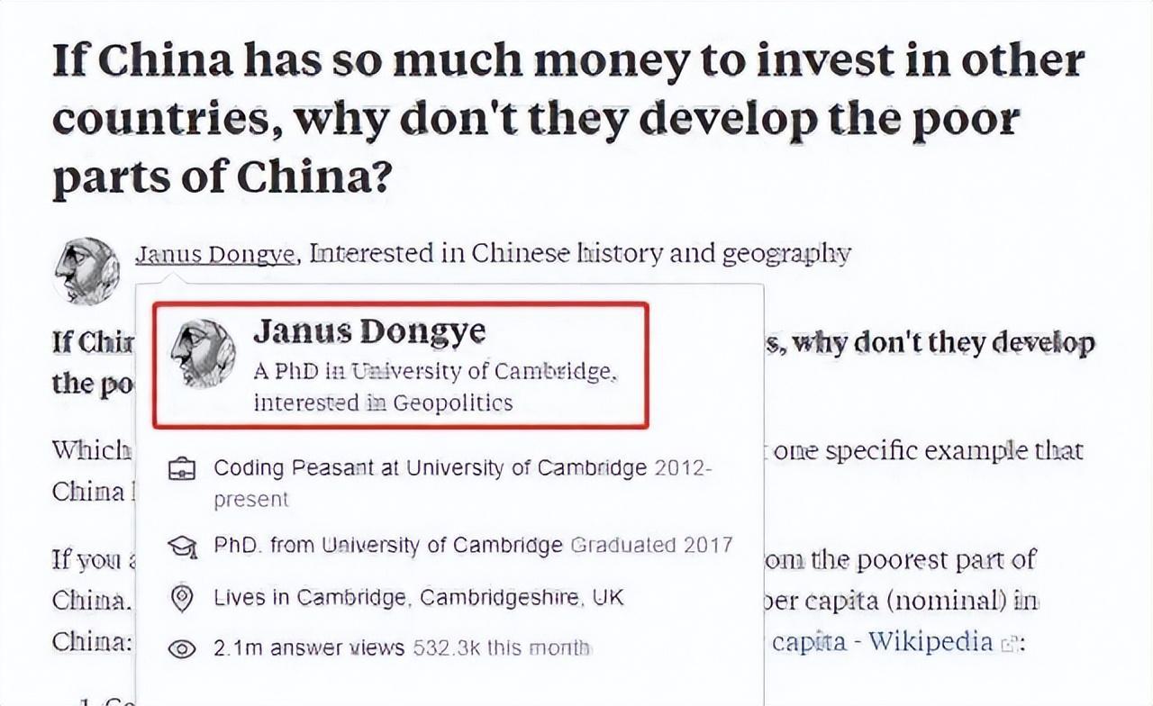 Janus Dongye,这个名字听起来很神秘,再加上他是英国剑桥大学的博士,很多人的第一反应肯定是“非我族类”。然而,事实证明,最了解中国的还是中国人自己。这位博士来自中国山东,因为外国人对中国的不了解,在Quora上对中国进行各种抹黑,作为一个中国人,他自然不能袖手旁观。另外,这位博士也想通过回答问题练习英语,于是在Quora上开始了答主的角色,专门回答与中国相关的问题。他之前的一篇答文《14亿中国人的口腹之欲怎样填饱》也获得了很多人的赞赏,甚至被人民日报转载。不过,由于博士使用的是化名,他的账号被封了。但每个人都有隐私权,博士选择使用化名是可以理解的,也许是有人害怕他的言辞锋利吧。博士也表示不再继续写作,将专注于科研为国家做出贡献。虽然我们会惋惜在"战场"上看不到博士的身影,但我们尊重博士的选择,并希望他在科研上有所成就。