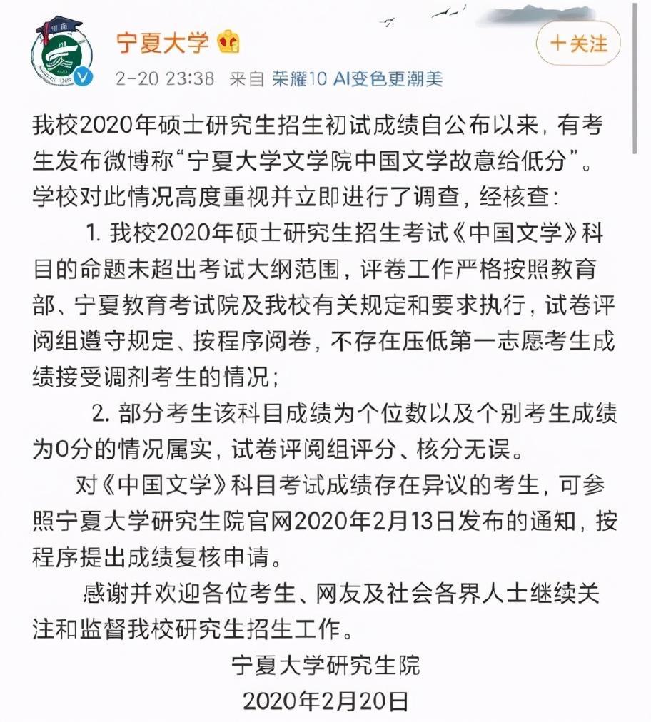 对此,宁夏大学官微专门作了声明,“不存在压低第一志愿成绩接受调剂考生的情况”;成绩为几分、十几分,个别0分的情况属实,评分、核分无误。