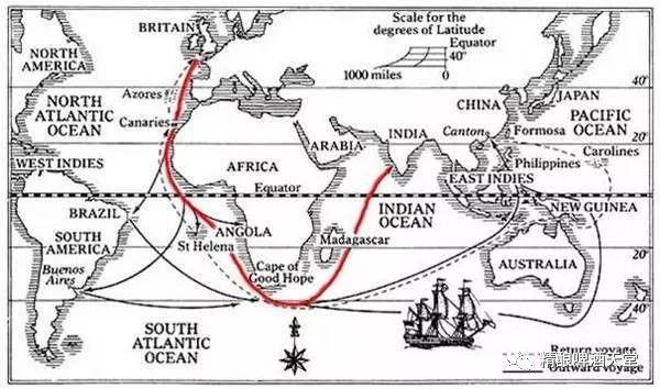这就不得不提提大英帝国的辉煌史了:18 世纪末期到 19 世纪,英国的殖民扩张可谓是达到了鼎盛时期,共占领了世界陆地总面积的四分之一,号称“日不落帝国”,而在这所有的殖民地中也包括印度。在殖民时期,英国派了大量军队驻扎于印度。为了给他们提供可以放心饮用的饮料(据说当时印度卫生太差),一些商人决定从英国本地用远洋货轮运送啤酒到印度。不过由于路途遥远(如上图),英国传统的啤酒很快就腐坏变质了。后来,他们发现大量加入啤酒花可以使啤酒不那么容易变质,于是一种有别于传统啤酒的新式啤酒应运而生。