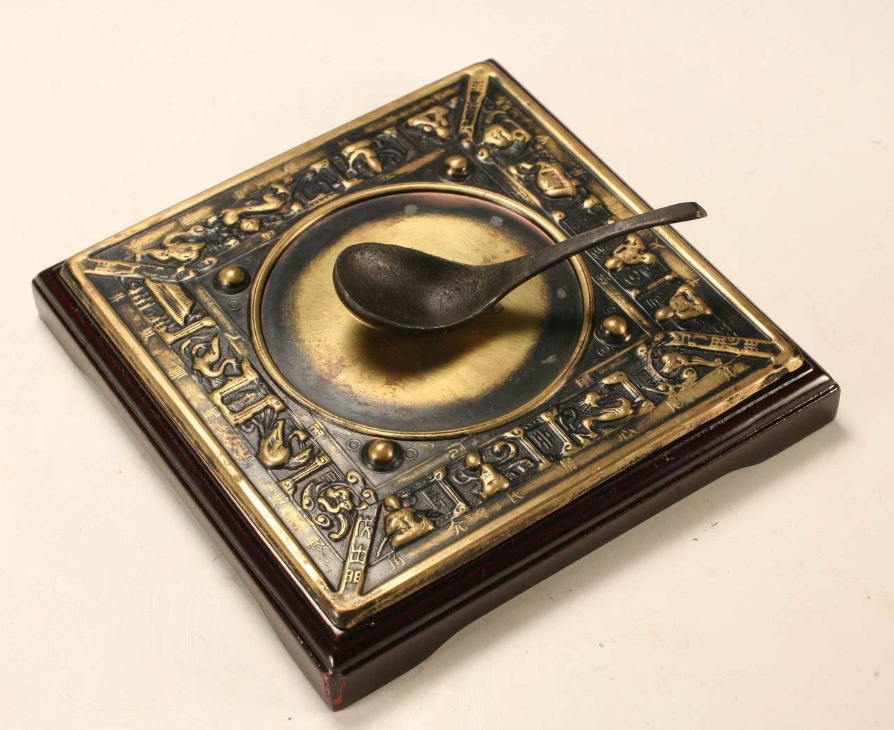 这个,是司南,被认为是指南针的前身。但是你在任何地方看到的这种勺子放在盘里的东西和张衡地震仪一样,都是现代人根据古籍描述做出来的摆件,毫无本身应有的作用。哪怕你在博物馆里看到的也是如此,因为迄今为止,考古就没发现过这种东西。现代人们也无法在古代技术下制造出一个真正有用的司南。所以和地震仪一样,到底是否真正存在过尚无定论。