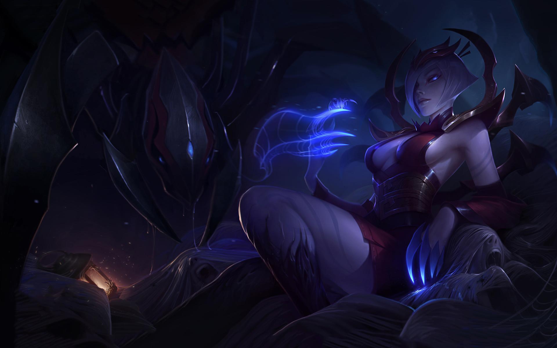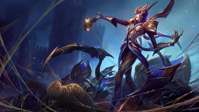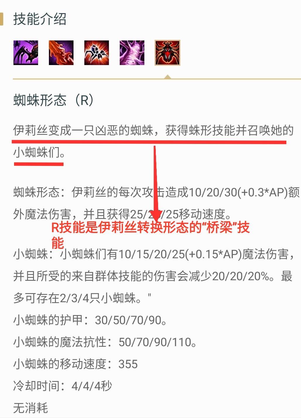 伊莉丝可通过R技能来进行两种形态下的转换,蜘蛛形态下的小蜘蛛每次攻击都会造成额外魔法伤害,并且获得一定的移速加成。