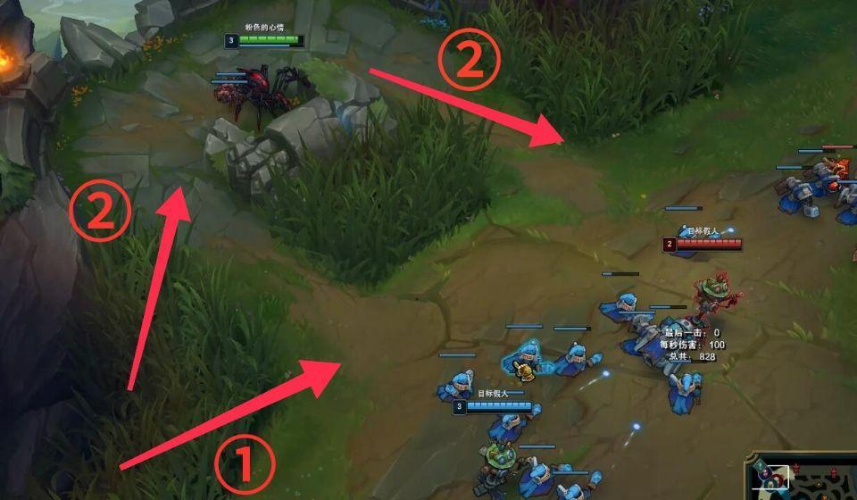 ②伊莉丝gank中路时的点位选择:伊莉丝gank中路应该按照下图①、②箭头所示方向进行gank,中路由于线程短,被发现后敌方英雄很容易逃回防御塔内,不易被gank。所以大多数情况下我推荐大家选择第②种绕后gank方式,毕竟绕后可以及时阻截敌方英雄,成功率当然也高。当然,要是对方英雄靠近己方防御塔附近,即我们常说的对方英雄推线进塔,这时就没有必要选择第②种方式了,果断选择第①种方式,以防因为gank线路的增长导致敌方英雄从另一侧河道溜走。