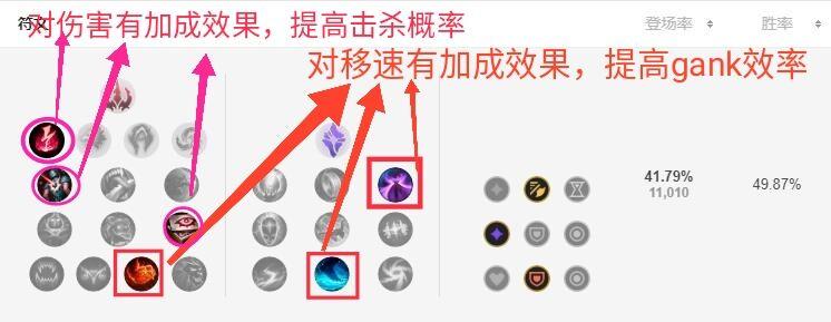 由于伊莉丝本身为前期爆发型英雄,所以我上图所示的这套符文天赋搭配。这套符文天赋的优势主要在于以下两部分:①为图中粉红色箭头所示天赋:电刑、恶意中伤、眼球收集器,这三个天赋无疑增强了伊莉丝在对战中的爆发伤害,伤害增加了也就提高了刷野的效率,同时也可以极大地提高线上gank时的击杀率。②图中红色箭头所示天赋:无情猎手、灵光披风、水上行走,这三个天赋对伊莉丝的移速有不错的加成效果,这使得伊莉丝可以更快的进行游走支援,无形之中节约了刷野的时间和提高了gank效率。