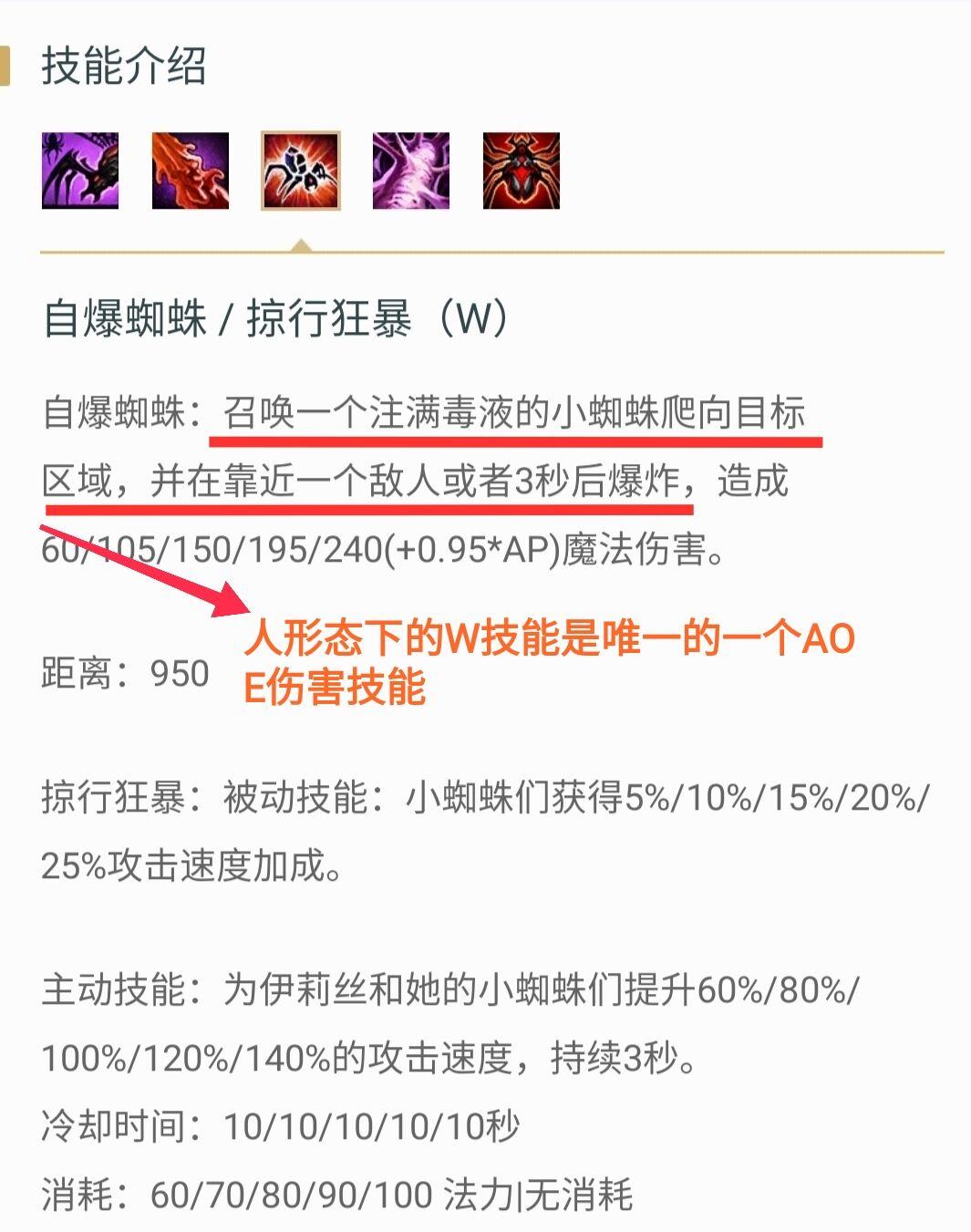 W技能(自爆蜘蛛/掠行狂暴):范围性伤害技能,提供自身和小蜘蛛攻速加成