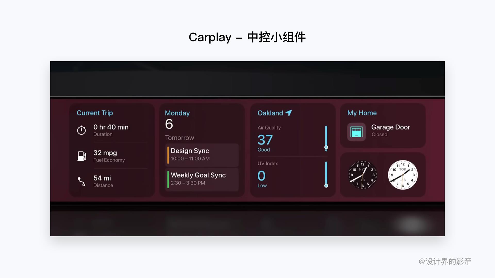 新版本的Carplay车载系统继承了iOS手机系统的小组件功能,将丰富的小组件,可以在各个屏幕上展示,有两大优点:丰富的信息+高度自定义。