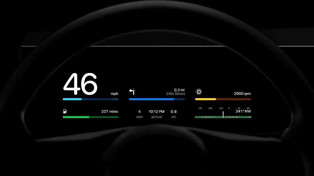 全新的Carplay将支持仪表的显示,仪表盘内可以显示车速(km/h)、最高转速(rpm)、油位、温度等信息,仪表盘的UI风格还可以定制化,根据自己的喜好设置成不同UI主题风格、背景和布局内容,也可以直接在仪表盘上查看天气、音乐、电话、导航、车辆信息等。