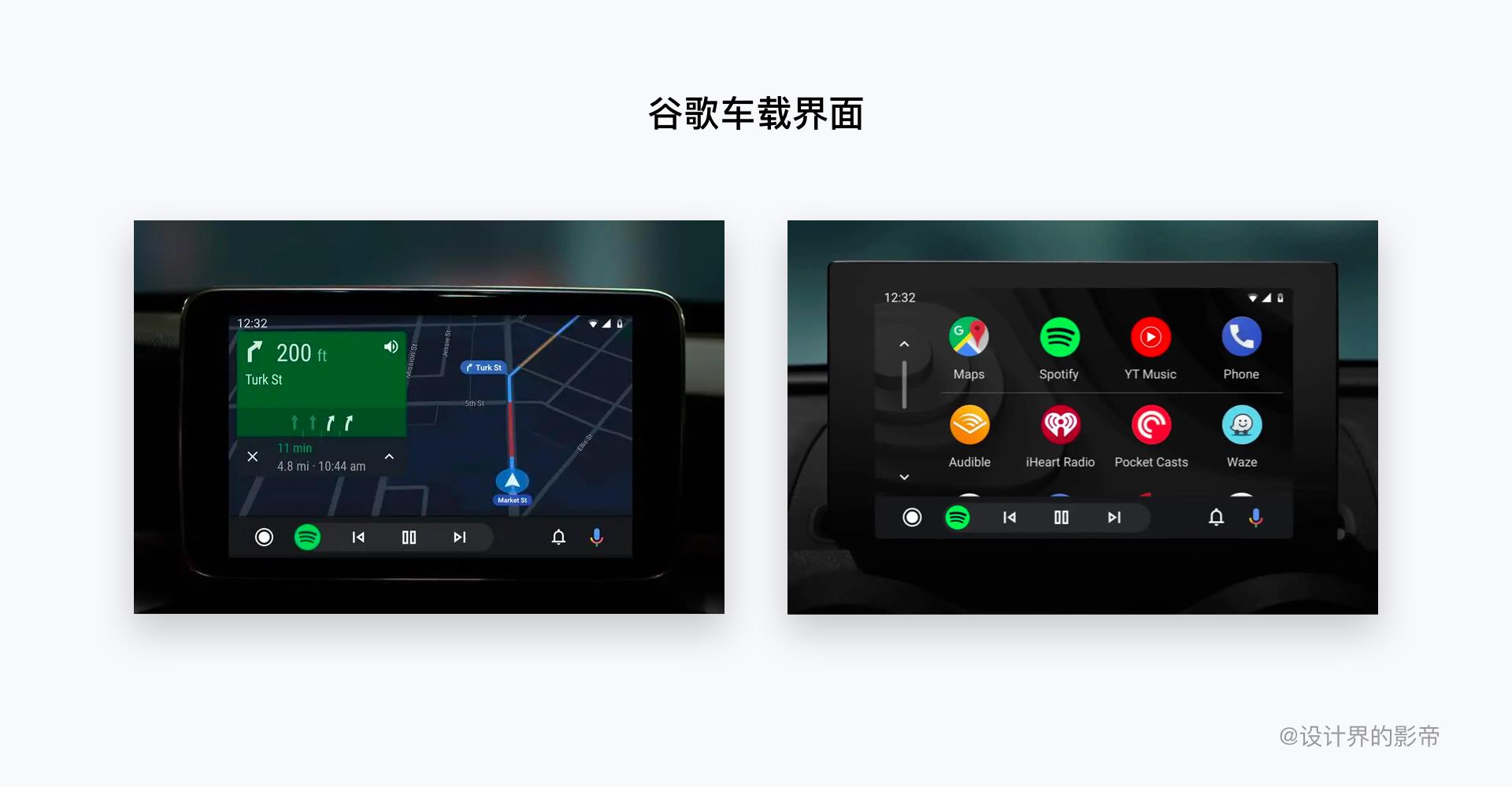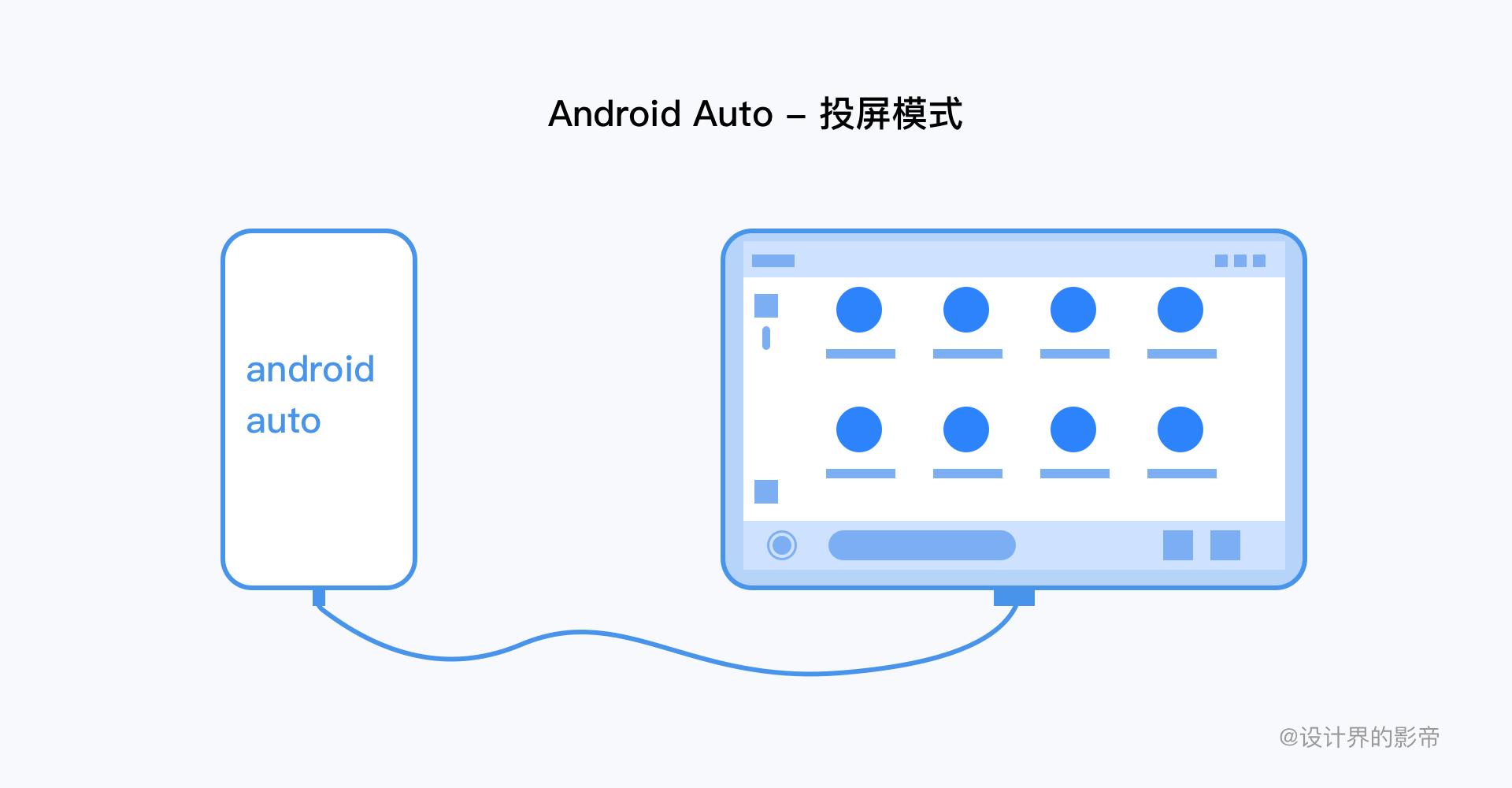 大家肯定分不清这两到底有什么区别呢?这一块内容不属于设计师工作范畴,因为他们车载系统设计是相同的,只是编译代码之间的区别。先简单通俗给大家区分一下,一个是通过手机投屏到汽车中控屏幕中,另外一个是直接植入车载的原生系统,AAOS可以根据车厂的需求定制化设计。