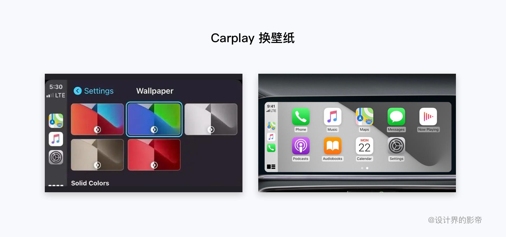 最早使用过Carplay车载系统的人肯定都吐槽过他的背景,要么是白色要么就是黑色,虽然车载的UI还是不错的,但总是用这种单色的壁纸,长时间肯定会引起我们视觉疲劳,所以在iOS版本上,Carplay做出一个决定,新增5张原生的壁纸,但是还是不能自定义壁纸。