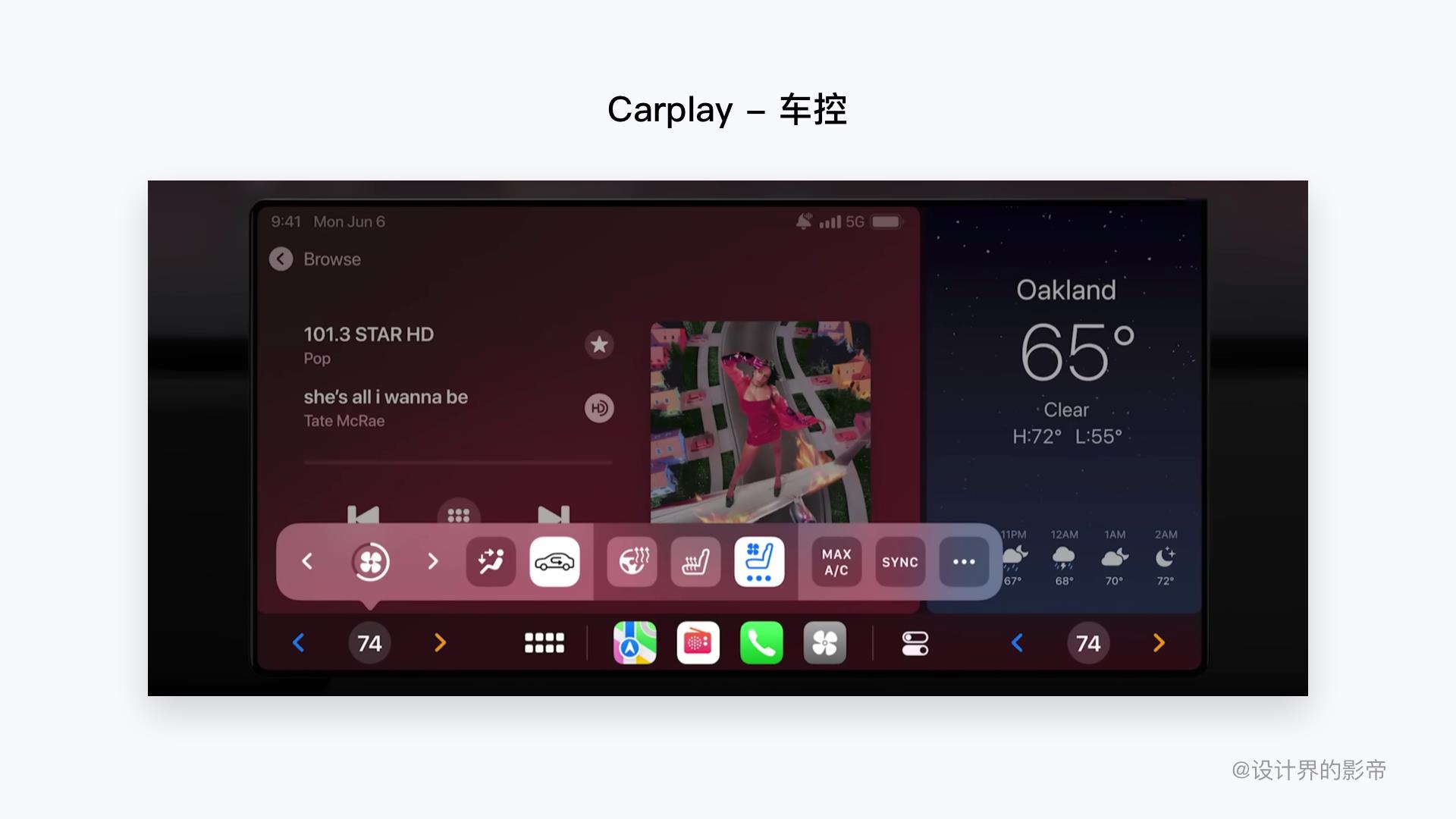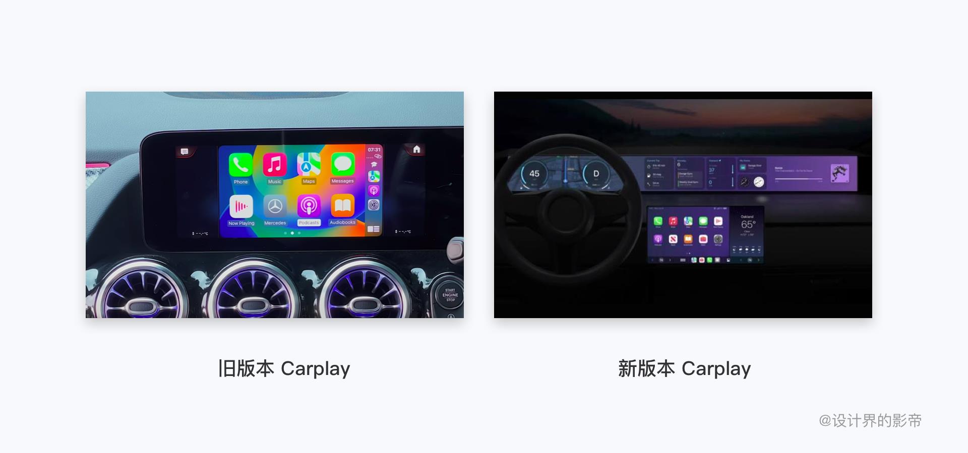 UI界面设计的功能终究只是表现层,但这次全新Carplay从原先中控转变成可以控制空调、收音机等,提高了与整车硬件更深度整合,原先调节空调需要先关闭Carplay,在原有的车控中调节温度,但新的CarPlay界面可依直接调节空调等车辆功能,并且还取代了原有汽车的仪表屏,形成了一个三连长屏。