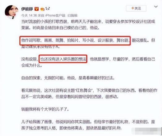 而且早在几年前,伊能静就在社交媒体上明确表示,恩利暂时并没有进入娱乐圈的想法。