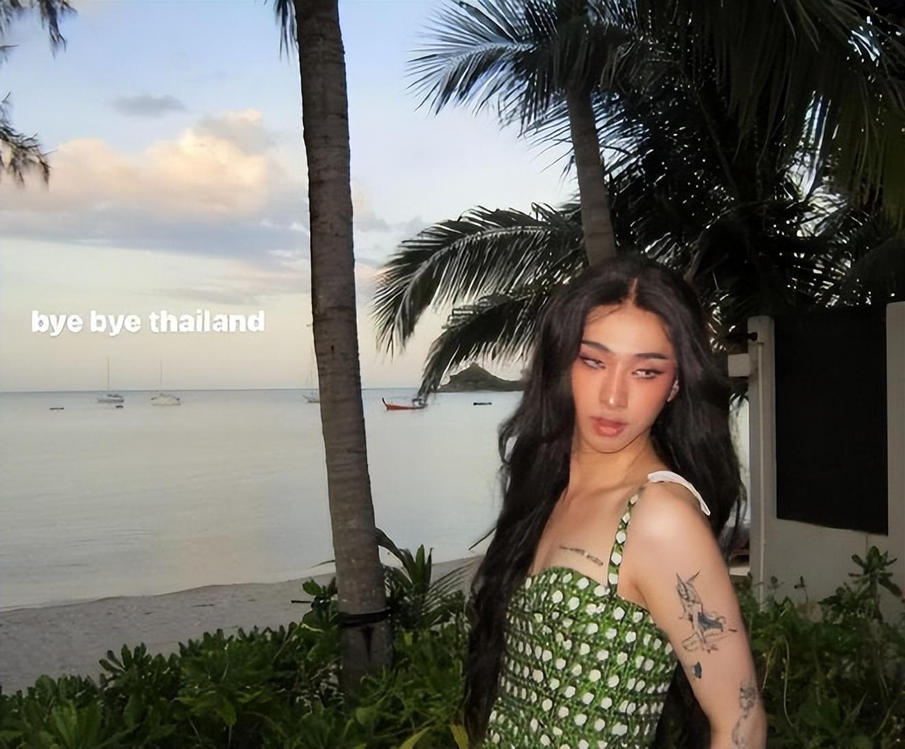 照片上,恩利身穿一抹渐变色绿裙,跪坐在柴火海滨的沙滩上,一头黑色长发引人注目,脸上的妆容精致,神情恍惚眼神迷离,整个人看起来,不知道的还以为是女孩。