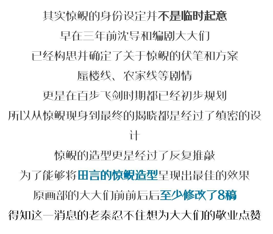 按照秦时明月官方的说法,惊鲵的造型身份设定是在三年前就已构思并确定了,蜃楼线、农家线等剧情更是在百步飞剑时期都已经初步规划。