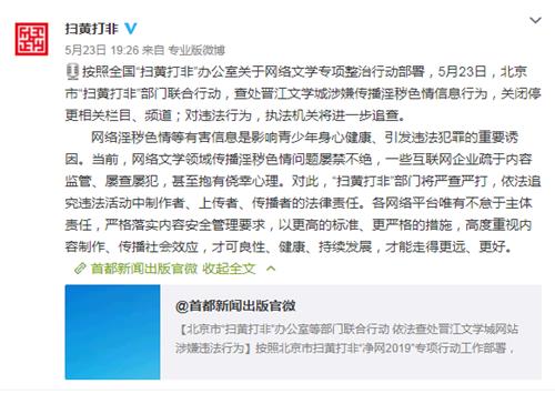 根据全国“扫黄打非”办公室官方微博显示,按照全国“扫黄打非”办公室关于网络文学专项整治行动部署,5月23日,北京市“扫黄打非”部门联合行动,对北京晋江原创网络科技有限公司运营的晋江文学城网站进行联合检查。经查,在该网站登载的网络作品中,《不知悔改的男人》、《妖孽养成日记》等作品涉嫌传播淫秽色情内容。对此,执法部门要求其关闭停更相关栏目、频道。