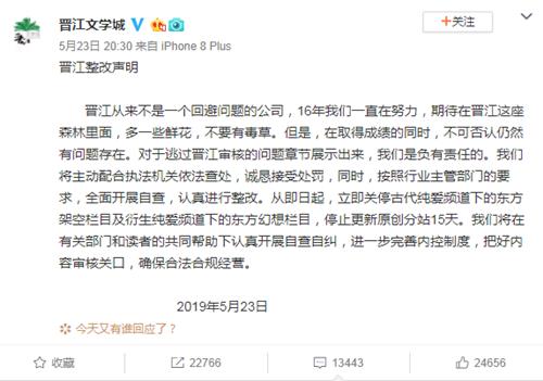 驱动中国2019年5月24日消息 近日,晋江文学城因部分作品涉嫌传播淫秽色情内容,遭相关执法部门查处。昨日晚间,晋江文学城官方微博发布《晋江整改声明》。声明中称,即日起关停部分栏目,并全面开展自查,认真进行整改。